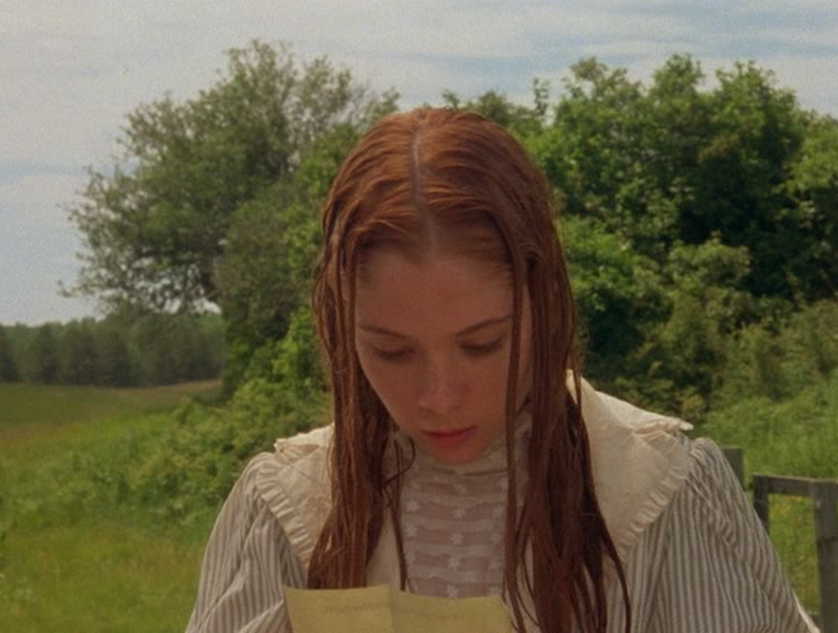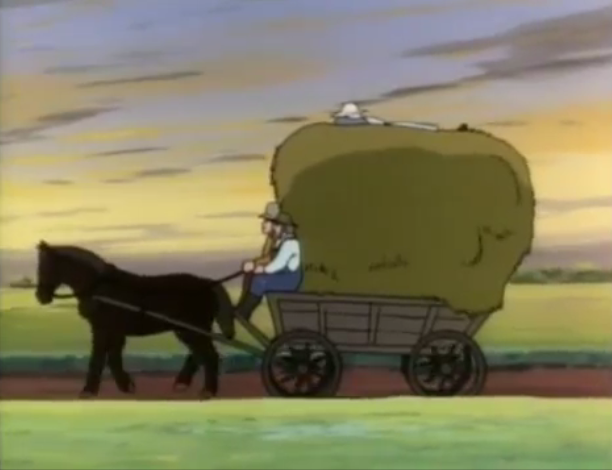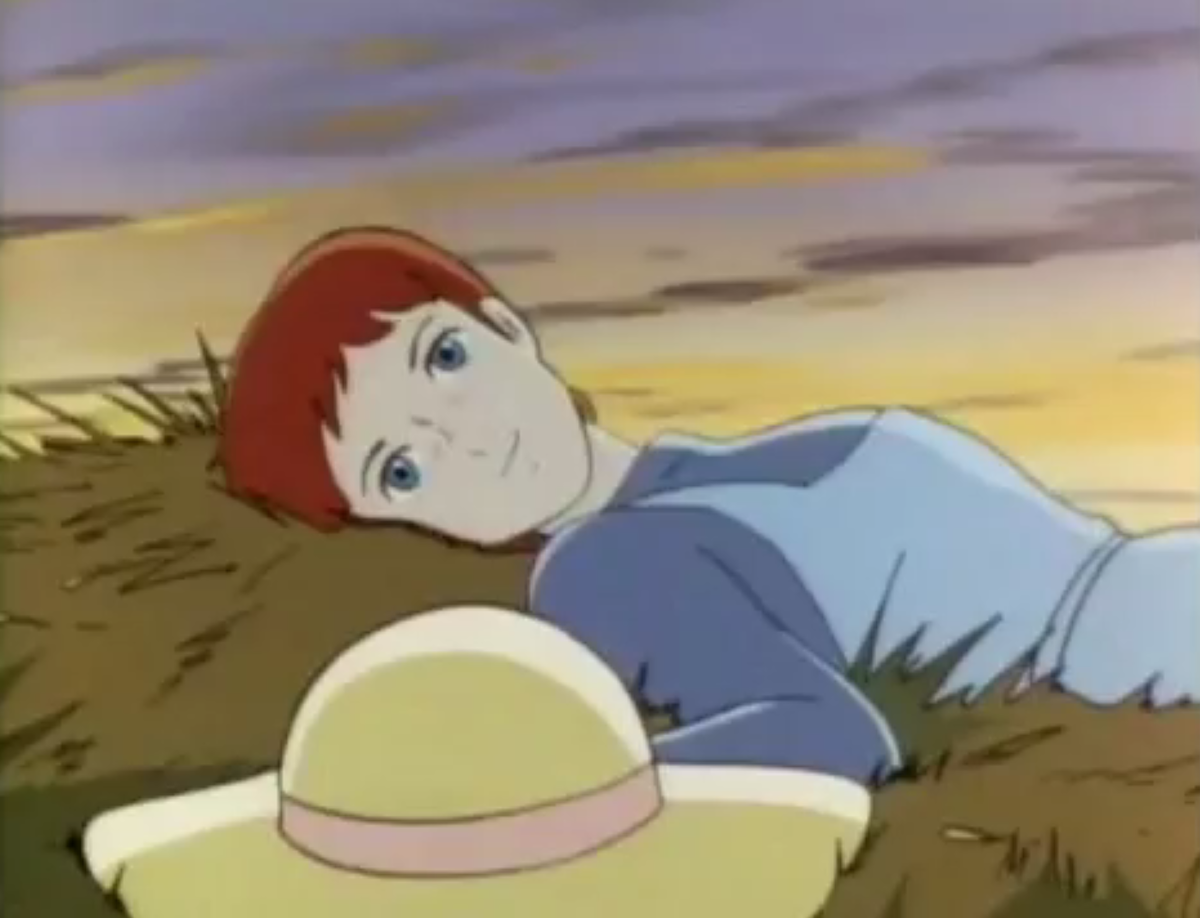 I was particularly taken by a scene in episode 39 of this adaptation where Marilla allows Anne to work with Jerry and Matthew out in the fields. In this version, Anne’s previous requests to join their farm labouring have been denied because such work is not considered appropriate for a girl. However, Marilla relents in this instance in the hopes that the exertion will distract Anne from “haunting” the post office to await her results. The plan has its desired effect, leaving Anne so tired at the end of the day she falls asleep fully dressed and without any stresses for the first time in weeks. Such endeavours also enable a beautiful sequence of Anne laying at ease on top of a tall pile of hay in Matthew’s cart – a rare moment of peace and serenity in an otherwise tense and anxious episode.