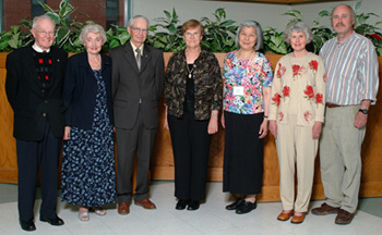 L-R: Dr. W.P. Bolger, Jennie Macneill, John Macneill, Dr. Mary Rubio, Yuko Izawa, Donna Campbell, and Ian Campbell at the 2004 conference banquet.