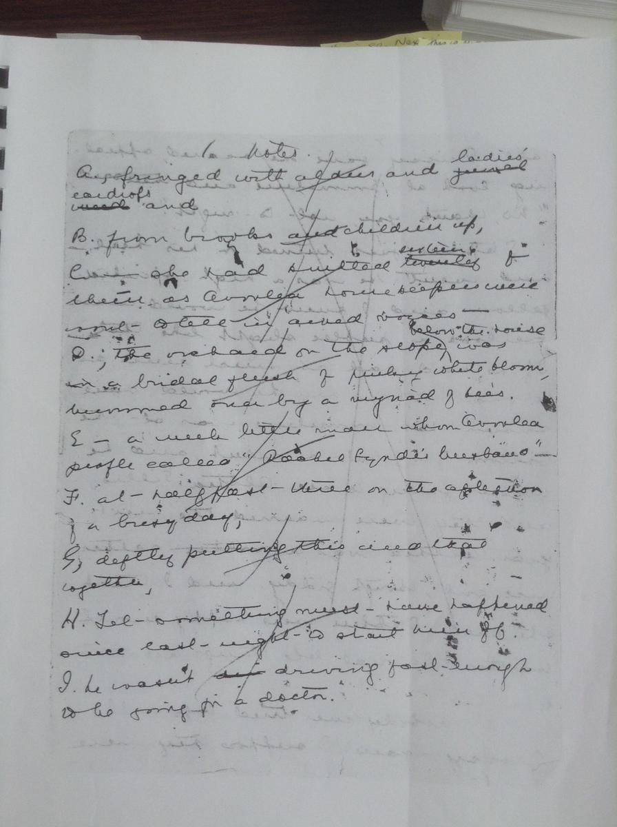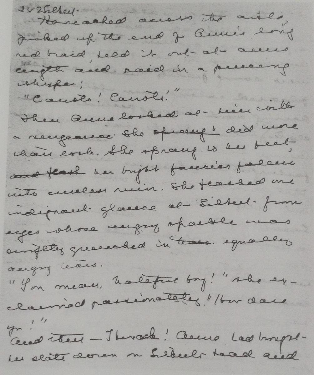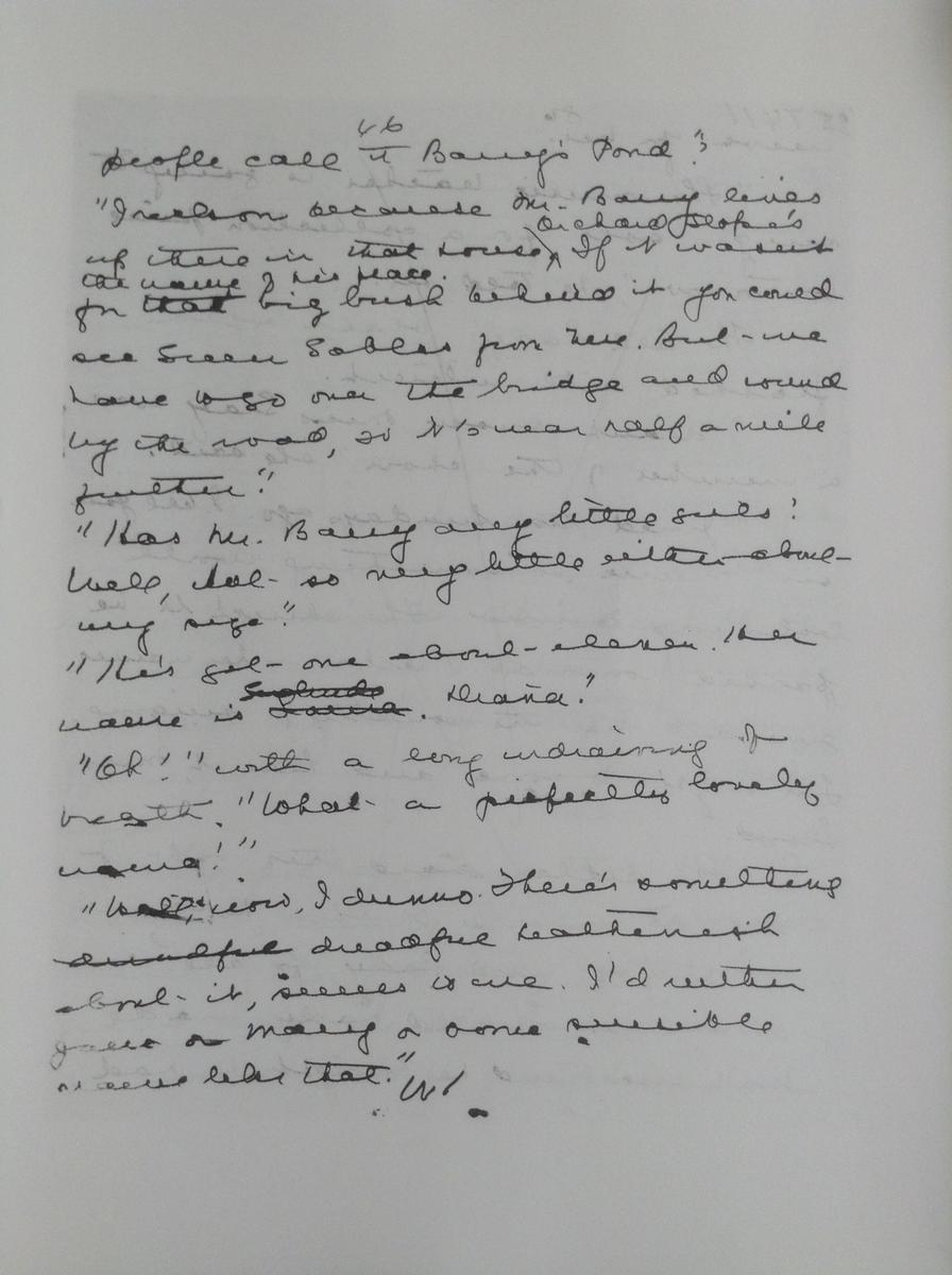 One interesting change occurred on page 46 of the manuscript where it is obvious Montgomery was undecided on what to call Anne's hoped-for "bosom friend." She considered "Laura," then "Gertrude," and finally settled on "Diana."