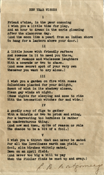 - Typescript poem entitled "New Year Wishes" signed by L.M. Montgomery and sent to George Boyd MacMillan. George Boyd MacMillan (1881-1953) was a Scottish journalist and writer, and a favourite correspondent of L.M. Montgomery. The two were first introduced, by letter, in 1903, through an American writer who was developing a circle of literary pen friends. Although Montgomery and MacMillan only met briefly in-person, during her 1911 honeymoon in Scotland, their voluminous exchange of letters, postcards, and gifts continued until late 1941, just months before Montgomery's death., L.M. Montgomery, This poem was also published in Good Housekeeping in January 1936 under the title "I wish you." It was also published in The Blythes are Quoted (2009), under the title, "I wish you." The Blythes are Quoted was intended by Montgomery to be the ninth volume of the Anne series. The poem is situated in Part 1 of the book which includes poems written by Anne and her son, Walter Blythe, before the First World War. Part 1 also includes "The Piper," the poem mentioned in Rilla of Ingleside that was written by Walter Blythe before his death. The manuscript for The Blythes are Quoted was delivered by L.M. Montgomery to her publisher on April 23, 1942, one day before her death., L.M. Montgomery Institute. Ryrie-Campbell Collection., Donated by Donna Jane Campbell.